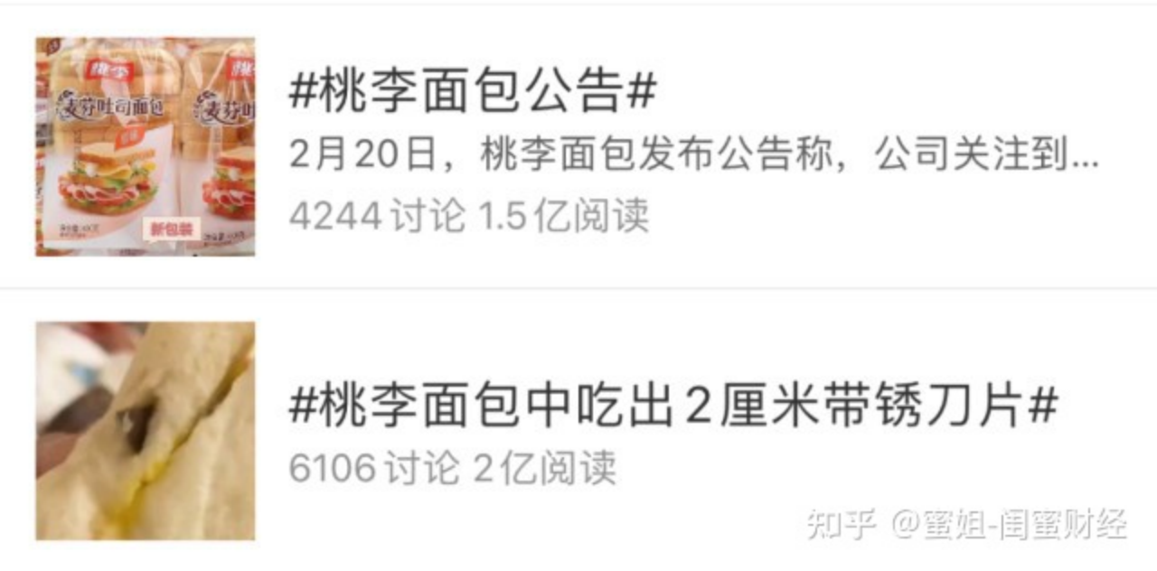讓我們回顧下事件的來(lái)龍去脈。2月17日,遼寧省鞍山市一名女子發(fā)視頻稱,自己在購(gòu)買的桃李面包三明治中,吃出了一個(gè)2到3厘米長(zhǎng)生銹的美工刀片。2月19日,#桃李面包中吃出2厘米的帶銹刀片#的話題沖上熱搜,閱讀次數(shù)超過(guò)2億次。