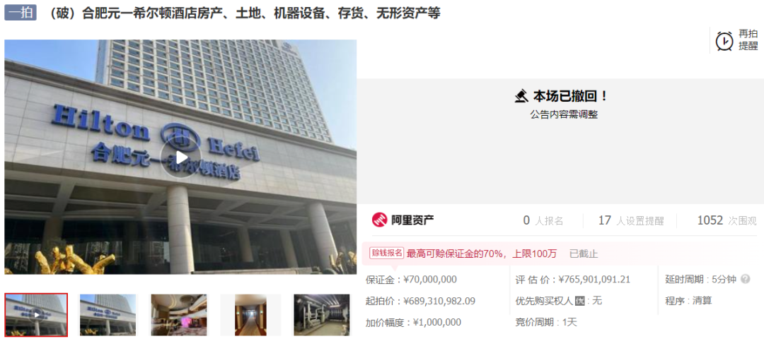 早在去年12月份,合肥市首批五星級酒店之一的元一希爾頓酒店被擺上“貨架”,安徽元一大酒店有限公司管理人將對該酒店進行破產(chǎn)清算資產(chǎn)進行拍賣,起拍價6.9億。公告發(fā)布后雖拍賣流程上發(fā)生了一些變化,但據(jù)知情人士講述,該酒店肯定是要拍賣的,時間和部分內(nèi)容可能要調(diào)整,但是拍賣的決定不會變,后續(xù)會重新公開發(fā)布公告。