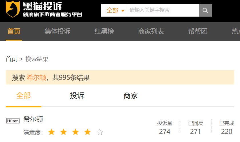 另一方面,快速擴張的加盟也導(dǎo)致酒店管理者對細(xì)節(jié)把控不足,常旅客對希爾頓品牌評價下滑等。在黑貓投訴平臺上搜索希爾頓可以發(fā)現(xiàn),目前希爾頓滿意度只有4星,投訴量272條,近30天投訴量多達22條。