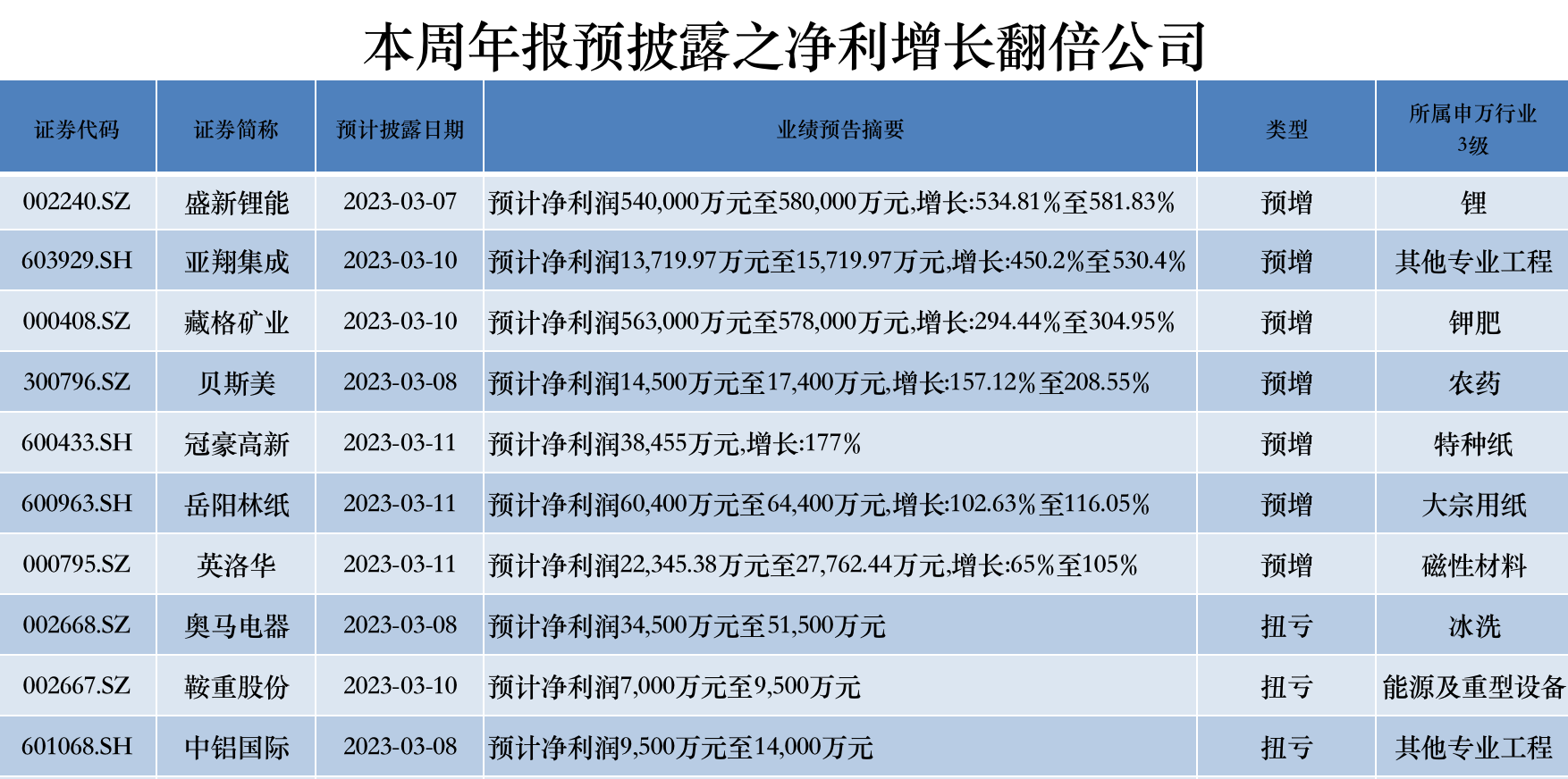 剔除扭虧公司,預(yù)計(jì)凈利潤(rùn)增長(zhǎng)最高翻倍的公司有7家,分別為盛新鋰能、亞翔集成(603929.SH)、藏格礦業(yè)(000408.SZ)、貝斯美(300796.SZ)、冠豪高新(600433.SH)、岳陽(yáng)林紙(600963.SH)、英洛華(000795.SZ)。
