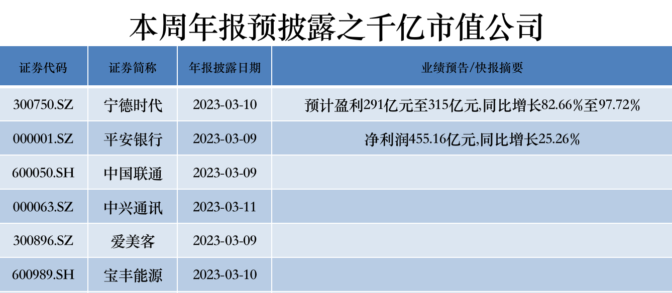 本周將發(fā)布年報(bào)的千億市值公司共6家,分別為寧德時(shí)代、平安銀行(000001.SZ)、中國(guó)聯(lián)通、中興通訊、愛(ài)美客(300896.SZ)、寶豐能源(600989.SH)。已有2家發(fā)布了業(yè)績(jī)快報(bào)或預(yù)告。