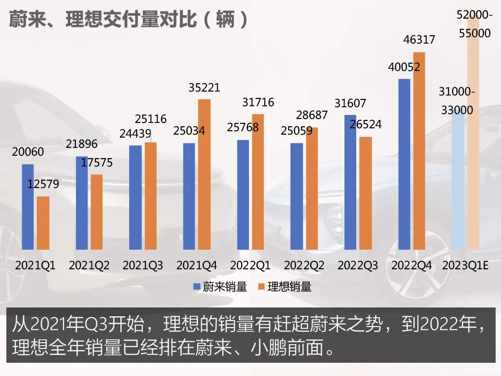 新勢力邁過“年銷10萬輛”的門檻之后,增速有所放緩。2022年,蔚來、理想銷量同比增長分別為33.9%、47.2%,低于新能源市場整體超90%的增速水平。隨著新一輪產(chǎn)品周期的到來,蔚來、理想兩家企業(yè)都對2023年定下了翻番的目標,月度銷量劍指3萬輛。