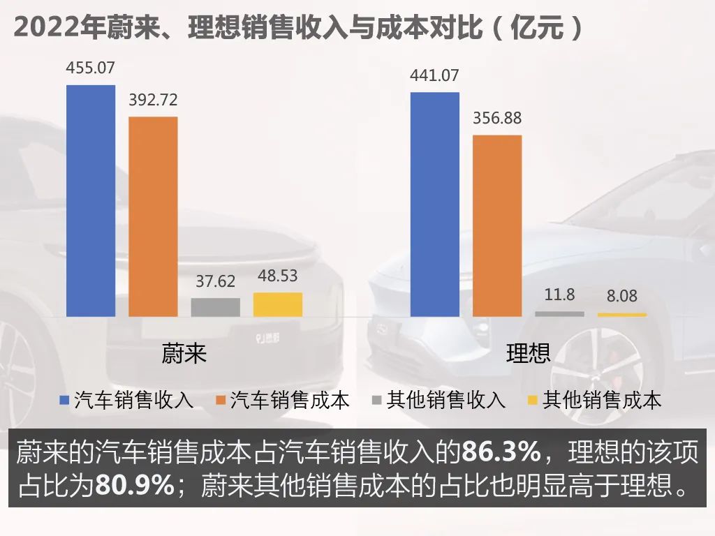 在汽車營收上,蔚來憑借高端調(diào)性,繼續(xù)保持了新勢力第一的位置。身后的理想則越追越緊,2022年汽車銷售收入已經(jīng)逼近蔚來的規(guī)模,而且單車成本控制比蔚來做得更好。