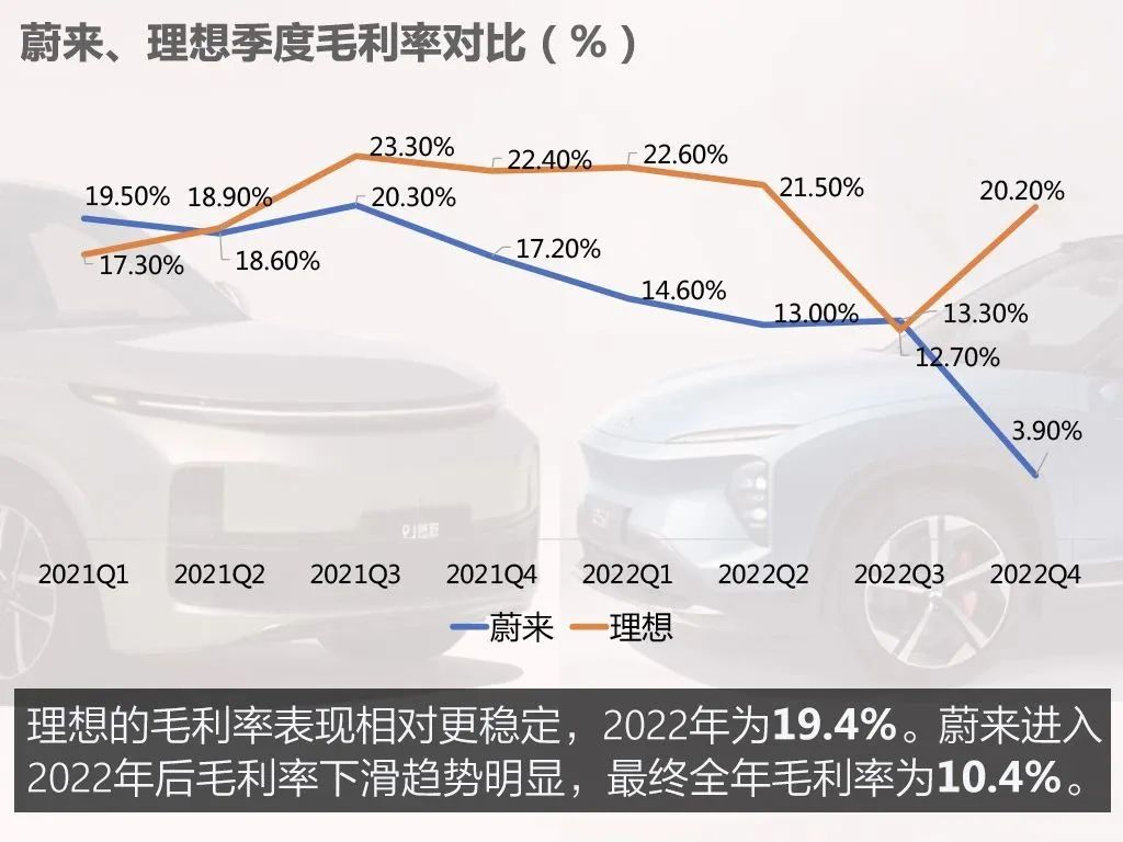 在2022年,蔚來和理想都在毛利率上有過“失守”,蔚來四季度的車輛毛利率為3.9%,大幅低于上年同期的17.2%和三季度的13.3%,官方解釋由和老款“866”車型相關(guān)的存貨撥備、生產(chǎn)設(shè)施加速折舊與購買承諾損失導(dǎo)致。剔除此方面影響后去年四季度的整車毛利率為13.5%。與前一季度相比有所下降的主要是產(chǎn)品組合變化,比如四季度毛利較低的車型ET5銷量增加了。