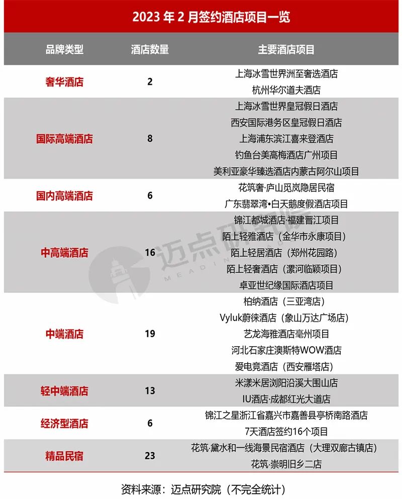 品牌酒店開(kāi)業(yè):據(jù)邁點(diǎn)研究院不完全統(tǒng)計(jì),2023年2月新開(kāi)業(yè)137家酒店,類(lèi)型橫跨全品類(lèi)。酒店類(lèi)型占比上,中端酒店最多,52家,格林豪泰酒店開(kāi)業(yè)突破10家,維也納酒店達(dá)到7家;其次是中高端酒店,45家;經(jīng)濟(jì)型酒店以24家的數(shù)量排名第三;然后是國(guó)際高端酒店、輕中端酒店、國(guó)內(nèi)高端酒店、奢華酒店和精品民宿。
