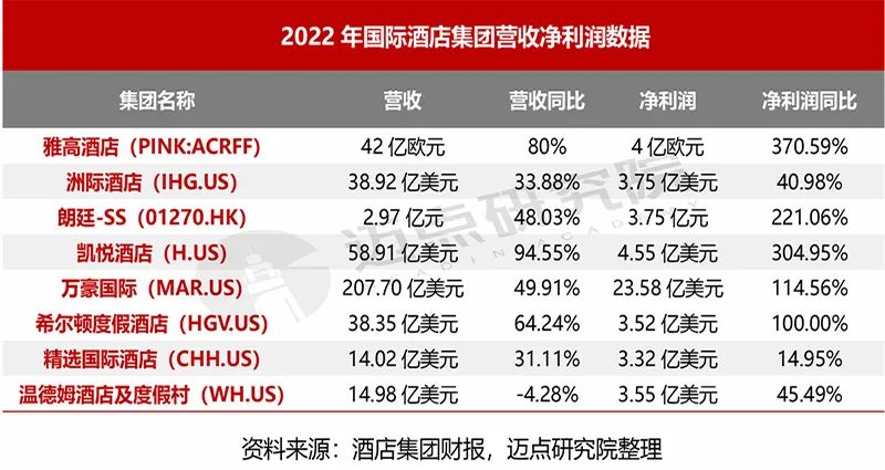 2月,酒店集團(tuán)陸續(xù)披露2022年業(yè)績(jī)情況。截止發(fā)稿,邁點(diǎn)研究院獲取8家酒店集團(tuán)財(cái)務(wù)數(shù)據(jù),總體較為可觀,凈利潤(rùn)同比均實(shí)現(xiàn)正增長(zhǎng),其中雅高集團(tuán)(PINK:ACRFF)、朗廷-SS(01270.HK)、凱悅酒店(H.US)、萬(wàn)豪國(guó)際(MAR.US)、希爾頓度假酒店(HGV.US)凈利潤(rùn)同比增長(zhǎng)超過(guò)100%,其中雅高集團(tuán)(PINK:ACRFF)凈利潤(rùn)同比370.59%,遙遙領(lǐng)先。2022年雅高(PINK:ACRFF)全年整體RevPAR對(duì)比2019年增長(zhǎng)了2%,凈利潤(rùn)4億歐元。其2022年雅高集團(tuán)積極全球拓展,截止12月,雅高酒店總數(shù)達(dá)到5445家,籌建酒店1247家。
