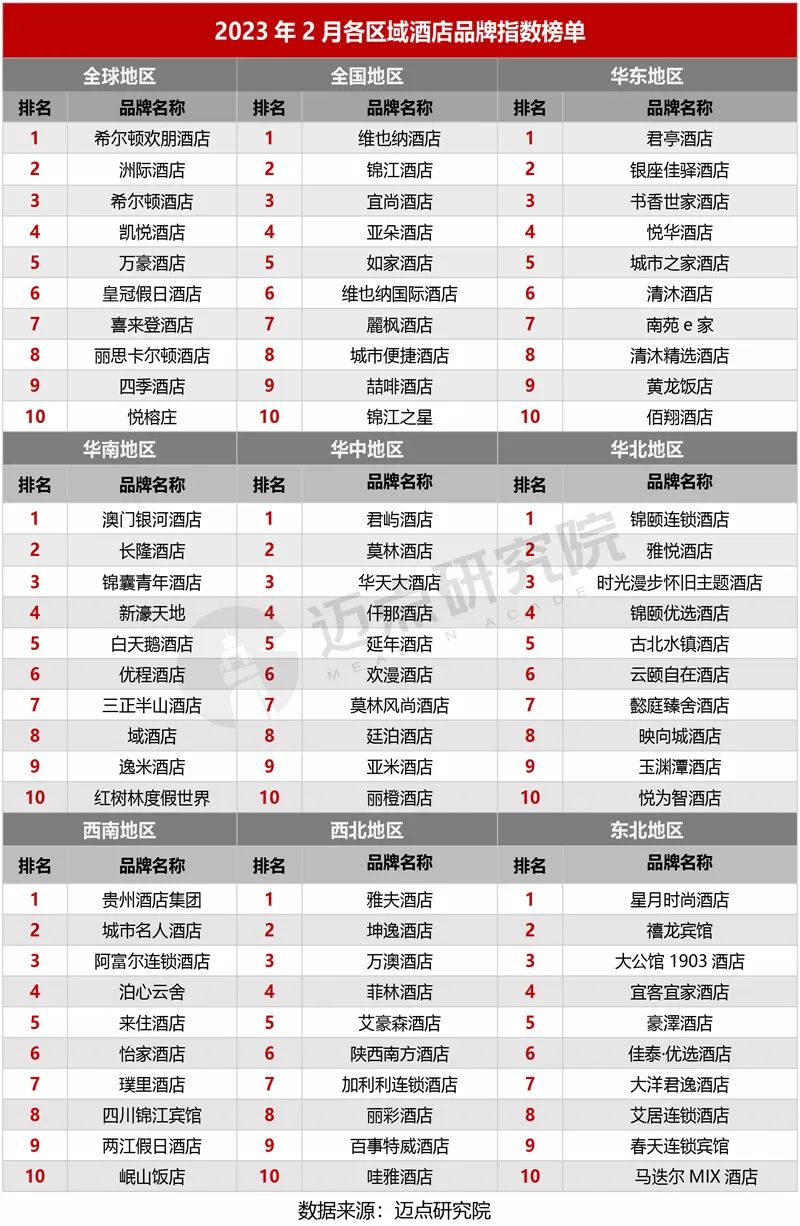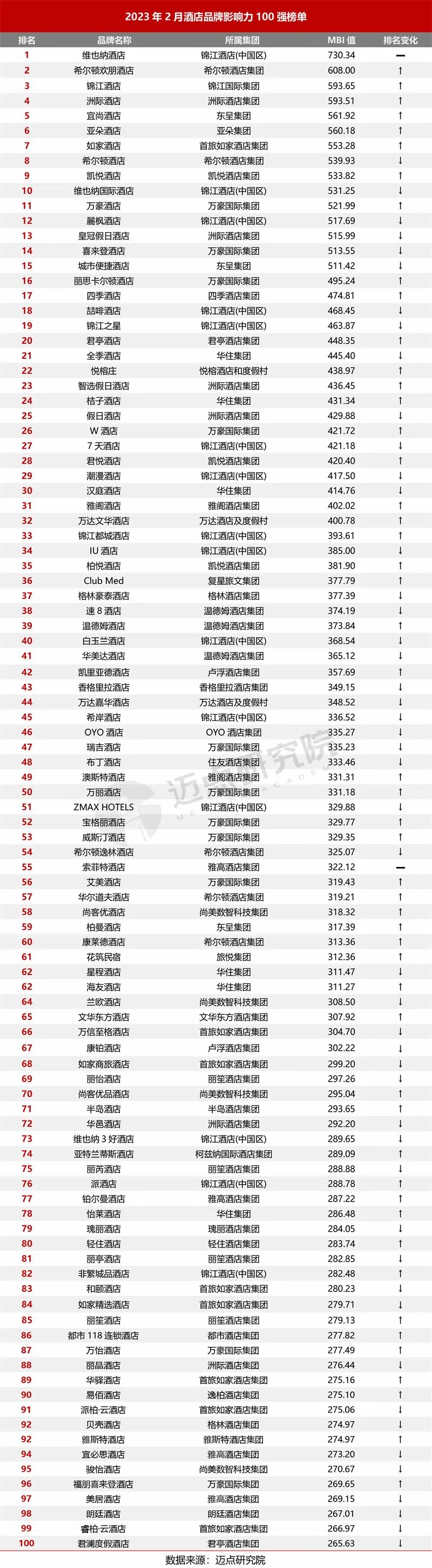 以下是邁點(diǎn)研究院獨(dú)家發(fā)布的“2023年2月酒店品牌影響力100強(qiáng)榜單”。 本月, 維也納酒店、希爾頓歡朋酒店、錦江酒店、洲際酒店、宜尚酒店、亞朵酒店、如家酒店、希爾頓酒店、凱悅酒店、維也納國(guó)際酒店進(jìn)入榜單前十。本月100強(qiáng)榜單中,共有33個(gè)品牌排名環(huán)比上升,53個(gè)品牌排名環(huán)比下降,1個(gè)品牌排名沒(méi)有發(fā)生變化。本月共有13個(gè)酒店品牌新晉百?gòu)?qiáng)榜單,分別為:索菲特酒店、蘭歐酒店、萬(wàn)信至格酒店、康鉑酒店、半島酒店、華邑酒店、麗芮酒店、麗亭酒店、麗笙酒店、麗晶酒店、易佰酒店、美居酒店、朗廷酒店。