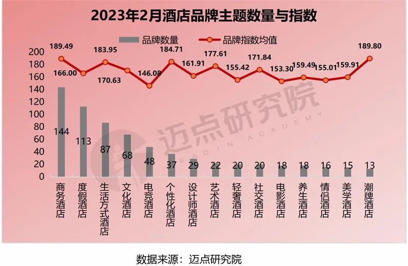據(jù)邁點(diǎn)研究院數(shù)據(jù)顯示,2023年2月酒店主題數(shù)量分布中,商務(wù)酒店占比最多,多達(dá)144個(gè);潮牌酒店占比最少,僅有13個(gè)。品牌指數(shù)均值來(lái)看,潮牌酒店、商務(wù)酒店、個(gè)性化酒店位列前三;電競(jìng)酒店品牌指數(shù)均值最低,為146.08,其品牌處于市場(chǎng)培育期,相對(duì)小眾。從品牌指數(shù)的環(huán)比變化來(lái)看,藝術(shù)酒店、商務(wù)酒店、生活方式酒店增幅較為明顯,主要得益于市場(chǎng)大環(huán)境的好轉(zhuǎn),商旅需求急劇攀升,酒店行業(yè)中占據(jù)重要一極的商務(wù)酒店快速恢復(fù),因此在回暖的2月,無(wú)論是品牌數(shù)量還是品牌指數(shù)均值,商務(wù)酒店的數(shù)據(jù)表現(xiàn)較為可觀。2月,生活方式酒店如一匹黑馬在快速?gòu)?fù)原的市場(chǎng)中嶄露頭角。生活方式酒店作為市場(chǎng)細(xì)分的一種酒店類(lèi)型,在國(guó)內(nèi)尚處于發(fā)展階段,無(wú)論是認(rèn)知還是認(rèn)同都存在局限。但市場(chǎng)的升級(jí)與群體的更迭致使傳統(tǒng)酒店的吸引力日漸下降,既滿足了消費(fèi)者的需求,又迎合酒店市場(chǎng)發(fā)展新方向的生活方式酒店逐漸邁入大眾視野。生活方式代表性酒店有:楓渡酒店、穆拉酒店、瑰寶酒店等。