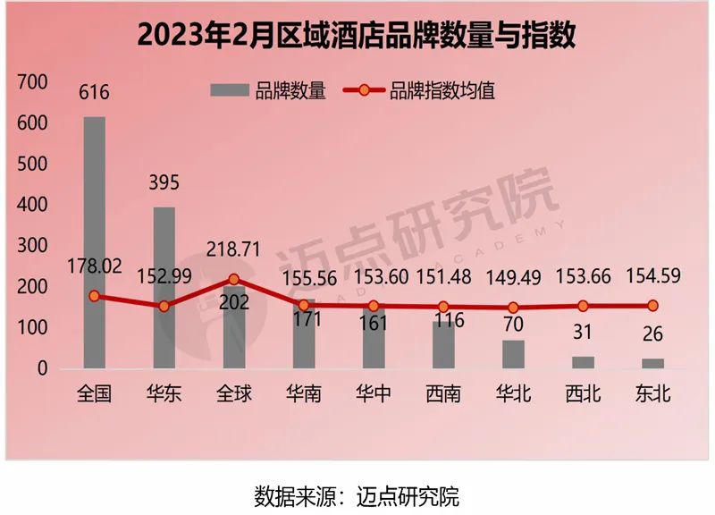 2023年2月區(qū)域酒店分布中,全國(guó)性品牌數(shù)量最多,有616個(gè);其次是華東區(qū)域品牌,有395個(gè);再次為全球性品牌,有202個(gè)。從各區(qū)域酒店品牌指數(shù)來(lái)看,全球性品牌以絕對(duì)性的優(yōu)勢(shì)領(lǐng)先,其次分別為全國(guó)、華南、東北、西北、華中、華東、西南、華北。各區(qū)域品牌指數(shù)平均值為169.14,全球性、全國(guó)性品牌高于平均值。