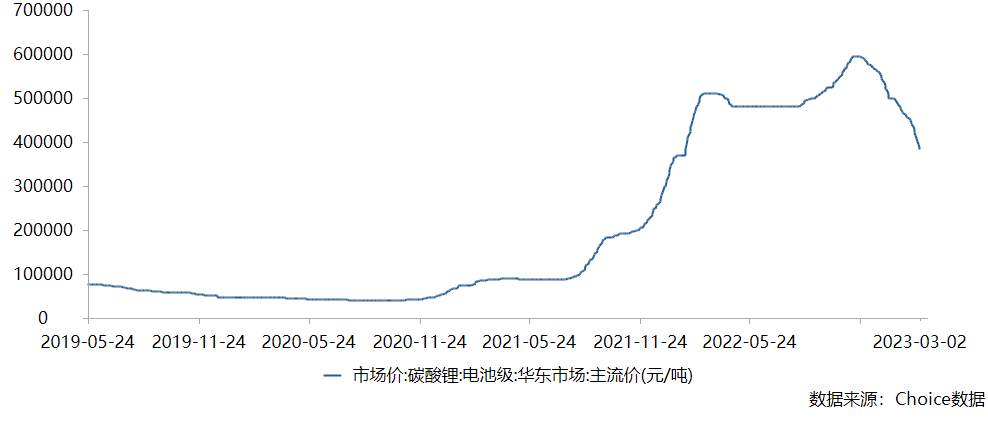 2023年突然爆火的Chat GPT概念,吸引了市場(chǎng)大部分的關(guān)注和熱錢的涌入,相比之下,2021年熱門的碳酸鋰最近好像“銷聲匿跡”一樣,實(shí)際上,碳酸鋰價(jià)格則是在2022年年底出現(xiàn)了松動(dòng)的跡象,截止2月27日,華東市場(chǎng)電池級(jí)碳酸鋰價(jià)格已經(jīng)從巔峰的近59.5萬元/噸,下滑至38.25萬元/噸,累計(jì)跌幅超過了35%,目前看仍在下行趨勢(shì)中。