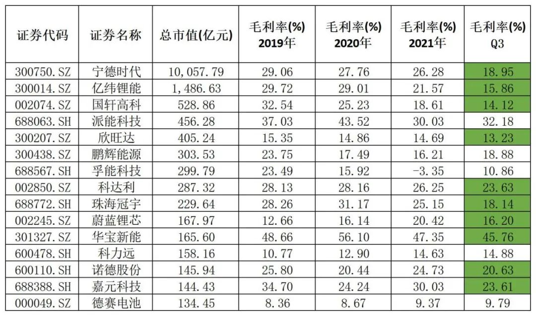 中游正負(fù)極及動(dòng)力電池端,盈利能力回歸和穩(wěn)固壁壘:以鋰電池板塊為例,根據(jù)申萬最新三級(jí)行業(yè)分類中,100億市值以上的公司來看,15家產(chǎn)業(yè)鏈中游的鋰電池廠商,10家毛利率出現(xiàn)下滑,行業(yè)前三毛利率平均下滑了6%左右。