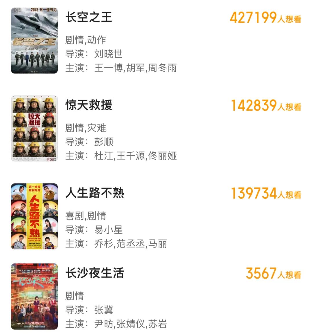 截止發(fā)稿前,《長空之王》貓眼想看人數(shù)已突破42萬,《人生路不熟》逼近14萬,而《驚天救援》《長沙夜生活》分別為14萬+和3567人。