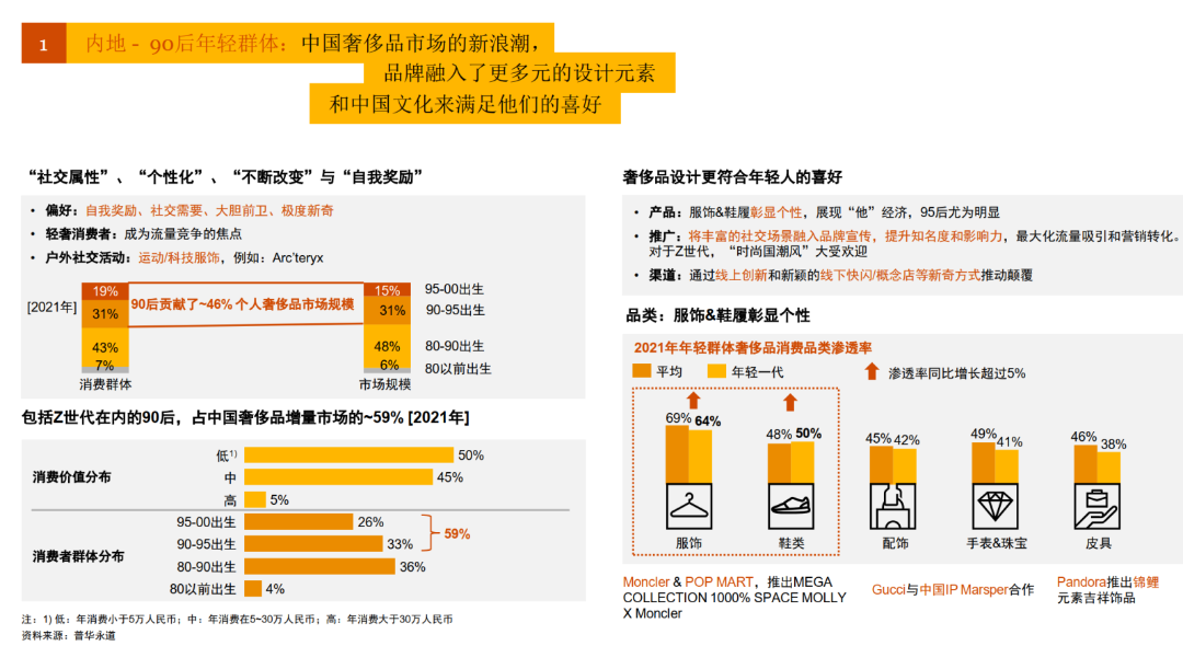 普華永道發(fā)布的《中國內(nèi)地及香港地區(qū)奢侈品市場(chǎng)洞察:“重塑客戶價(jià)值,實(shí)現(xiàn)可持續(xù)增長”》報(bào)告數(shù)據(jù)顯示,2021年90后貢獻(xiàn)了46%的個(gè)人消費(fèi)品市場(chǎng)規(guī)模,作為輕奢愛好者,他們更注重社交屬性,個(gè)性化,不斷改變以及自我獎(jiǎng)勵(lì),他們大膽前衛(wèi),極度新奇,是流量競(jìng)爭(zhēng)的焦點(diǎn)。