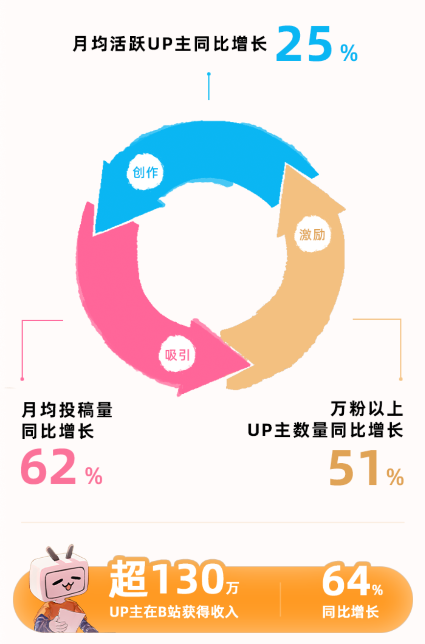 反映到財報數(shù)據(jù)上,這一思路確實刺激了更多UP主的創(chuàng)作欲望。2022年第四季度,B站月均活躍UP主同比增長25%,月均投稿量和萬粉以上的UP主數(shù)量分別實現(xiàn)62%和51%的同比增長。在這之中,超130萬UP主在B站獲得收入,同比增長64%。