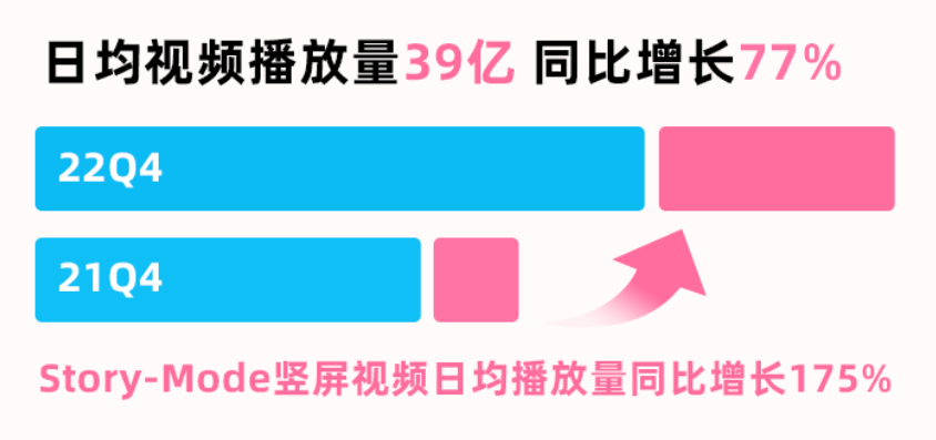 財報數(shù)據(jù)顯示,2022年第四季度,在社區(qū)內(nèi)容整體日均播放量同比增長77%的前提下, 2022年第四季度Story-Mode豎屏視頻日均播放量同比增長175%。且在平臺廣告業(yè)務(wù)逆勢增長的過程中,第四季度效果類廣告收入同比增長超50%,這其中同樣離不開Story-Mode豎屏視頻所構(gòu)建的新廣告場景。