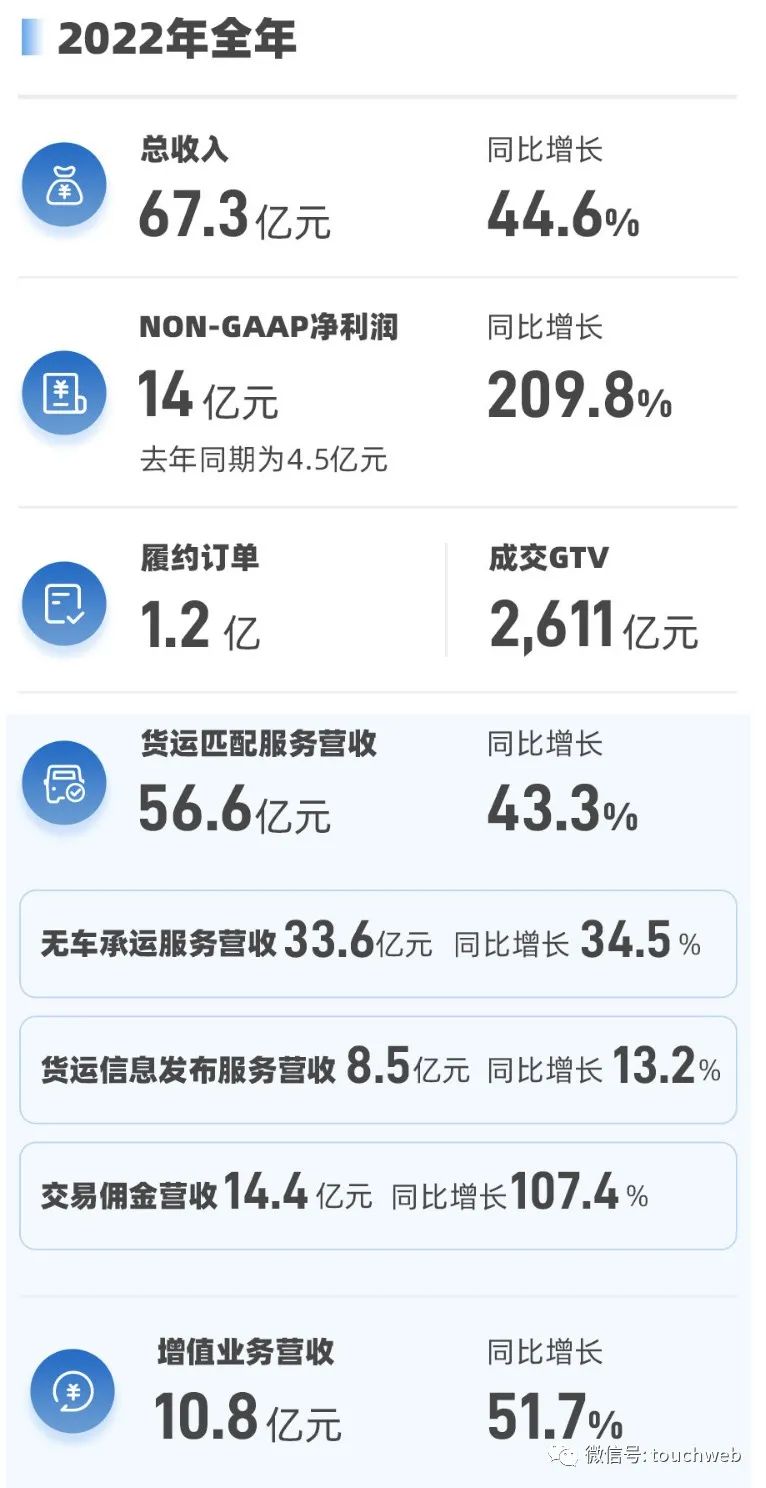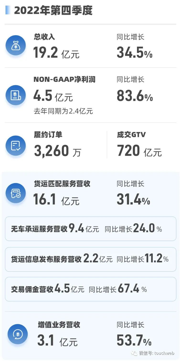 滿幫集團2022年第四季度來自貨運匹配服務營收16.14億,較上年同期的12.29億增長31.4%;增值服務營收3.08億,較上年同期的2億元增長53.7%。