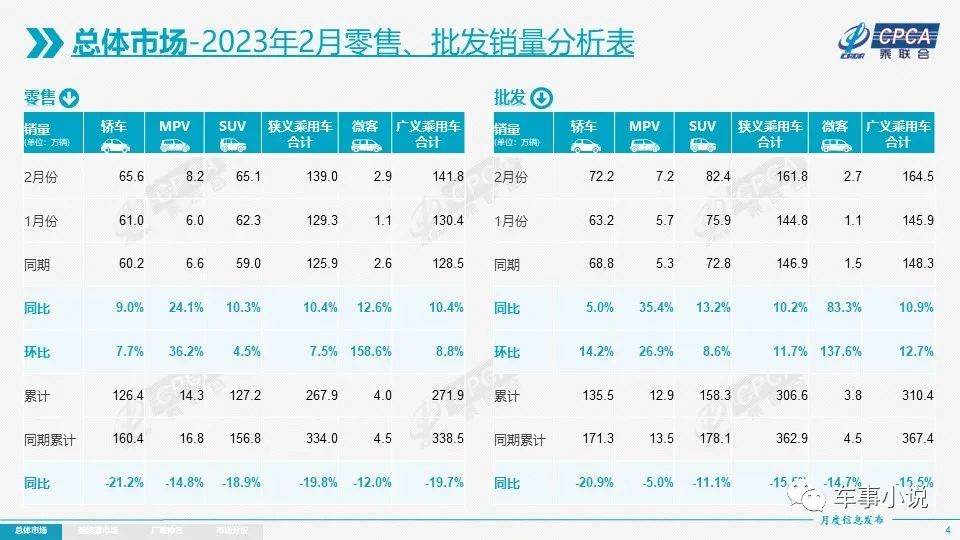 批發(fā)方面,2月份共實現(xiàn)批發(fā)銷量161.8萬輛,同比增長10.2%,環(huán)比增長11.7%。對此,乘聯(lián)會指出,批發(fā)市場2月增長勢頭主要得益于各個版塊細分市場領(lǐng)軍車企的拉動。如,比亞迪汽車、長安汽車、吉利汽車、奇瑞汽車,以及特斯拉中國,廣汽豐田、華晨寶馬、北京奔馳等。