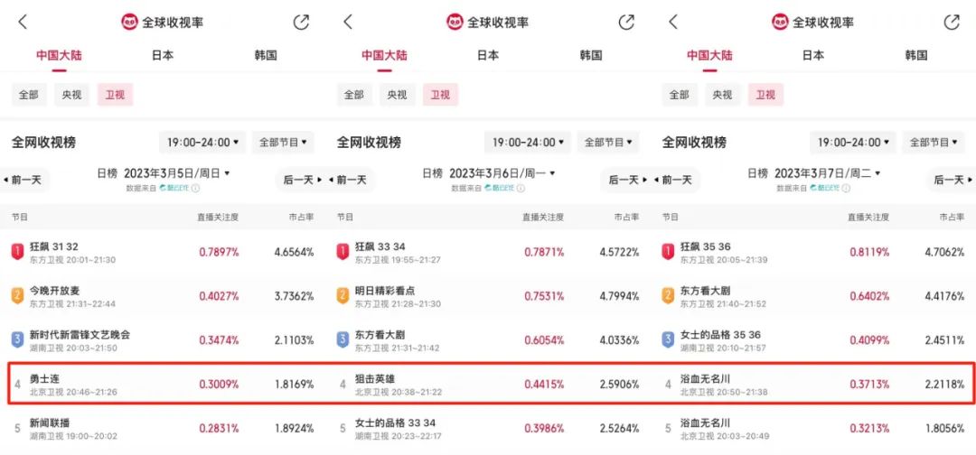 根據(jù)酷云數(shù)據(jù),在3月5日-3月7日這三天的黃金時(shí)段,率先播出的《勇士連》《狙擊英雄》《浴血無名川》三部影片的直播關(guān)注度均達(dá)到全網(wǎng)第四。像6號(hào)播出的《狙擊英雄》市占率還達(dá)到了2.59%,三日總體表現(xiàn)優(yōu)于接檔前的《對(duì)手》(已多輪播放),完全可以驗(yàn)證電視觀眾對(duì)網(wǎng)絡(luò)電影的良好接受度。
