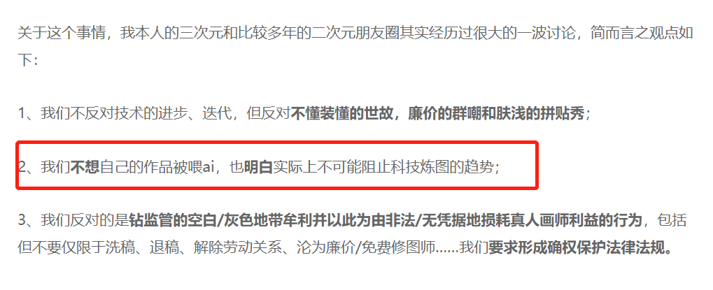 而跳出LOFTER單個(gè)平臺(tái),對(duì)內(nèi)容社區(qū)的創(chuàng)作者們來(lái)說(shuō),真正的問(wèn)題要復(fù)雜得多。例如最直接的一點(diǎn)是:LOFTER可以承諾AI不采集平臺(tái)“太太們”(作者們)的作品,但很多技術(shù)公司壓根不會(huì)這么承諾。