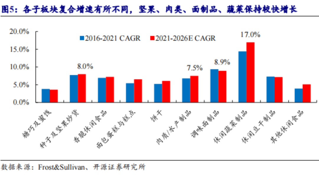 各個子行業(yè)所處的產(chǎn)品周期也不同,造就了各自增速上的巨大差異。像是種子堅果類、肉質(zhì)水產(chǎn)制品、調(diào)味面制品、休閑蔬菜制品的年復(fù)合增長率,都在7.5%以上。