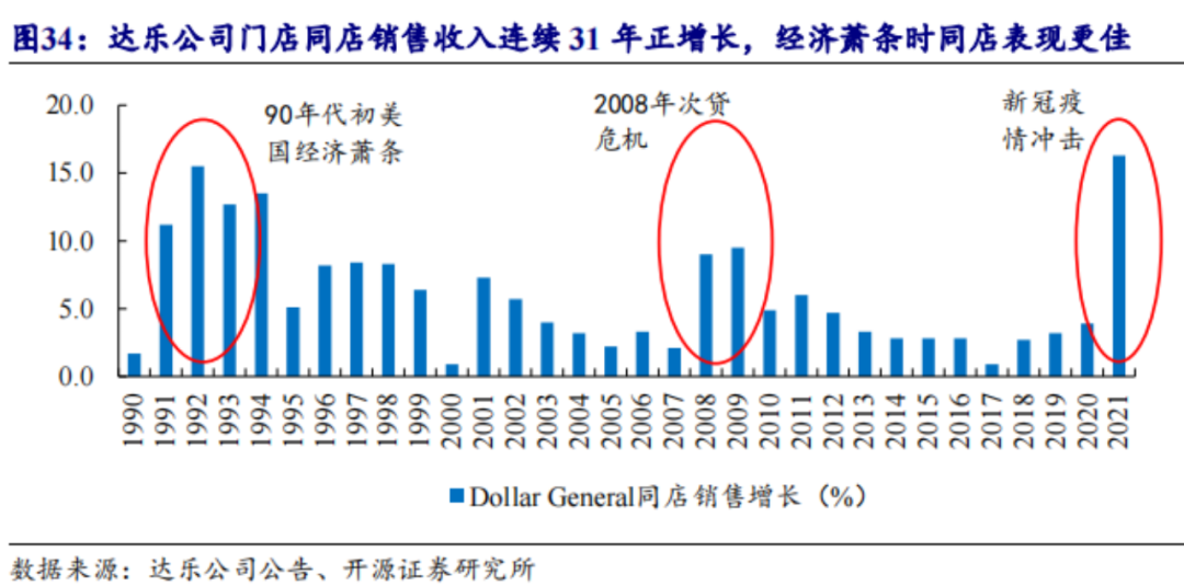 性價比優(yōu)勢保證了達(dá)樂公司具備很強的抗風(fēng)險能力,越是在不可抗力的影響下,他們的門店銷量反而能再創(chuàng)新高。