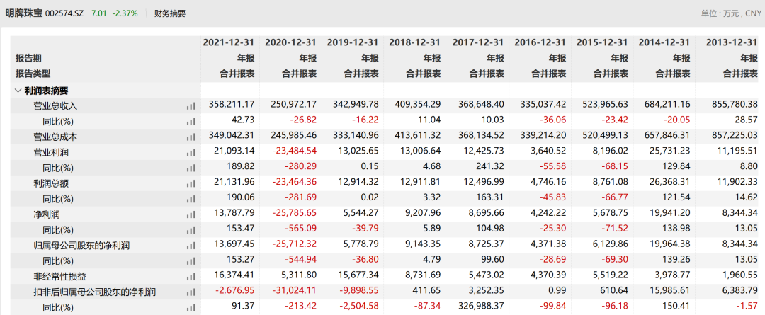 上市之初,虞氏家族曾憑借超高的控股比例實現(xiàn)身價暴漲,明牌珠寶的股價也一度沖至39元/股,然而接下來的劇情卻是“上市即巔峰”。此后的時間里,公司營收先增后降,股價則一路下跌,2021年最低時僅剩3.5元/股。如今雖略有回升,但相較高點仍相去甚遠。截至3月10日,公司股價6.81元/股,市值36億元。