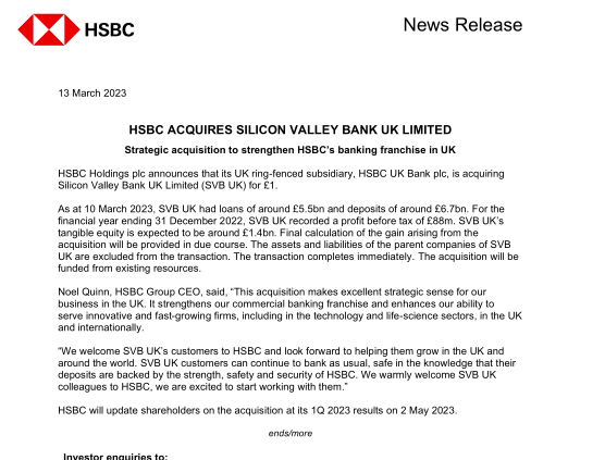 3月13日,匯豐控股公告,其英國子公司匯豐銀行英國將以1英鎊的價格收購硅谷銀行英國子公司(SVB UK)。