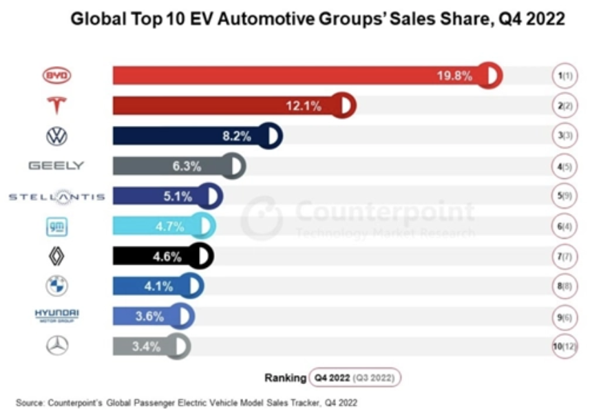 3月9日消息,市場(chǎng)研究機(jī)構(gòu)Counterpoint發(fā)布了最新全球電動(dòng)汽車市場(chǎng)報(bào)告,2022年總計(jì)銷量超1020萬(wàn)輛,比亞迪、特斯拉和大眾集團(tuán)位列排行榜前三。比亞迪無(wú)疑已經(jīng)成為讓特斯拉感到警惕的一個(gè)對(duì)手。