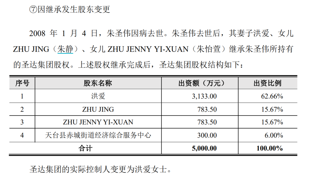 然而天有不測(cè)風(fēng)云,2008年圣達(dá)藥業(yè)銷(xiāo)售額飛速成長(zhǎng)的同時(shí),也迎來(lái)了朱圣偉身故的噩耗。自此,洪愛(ài)成為了公司的頂梁柱,而對(duì)于年僅9歲的朱怡萱來(lái)說(shuō),這可能是她第一次成為一家公司的股東,方式則是法定繼承。