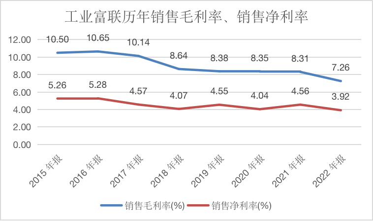 2022年,工業(yè)富聯(lián)銷(xiāo)售毛利率為7.26%,銷(xiāo)售凈利率也僅為3.92%,分別下滑1.05個(gè)百分點(diǎn)、0.64個(gè)百分點(diǎn)。公司毛利率已連續(xù)6年下滑,且下滑幅度有所擴(kuò)大。