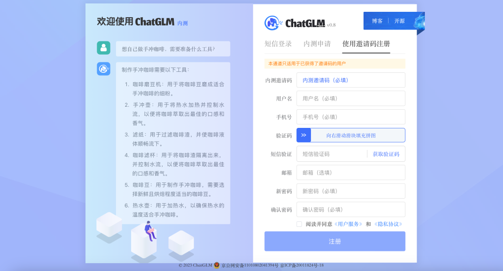 由清華大學(xué)計算機(jī)系技術(shù)成果轉(zhuǎn)化而來的公司智譜AI,現(xiàn)已開啟ChatGLM線上模型的內(nèi)測。用戶需要使用邀請碼進(jìn)行注冊,也可以填寫基本信息申請內(nèi)測。