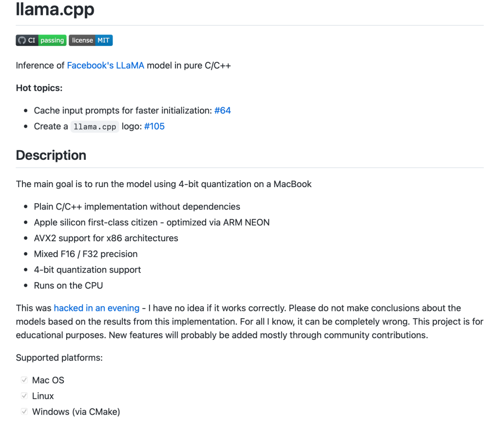 Georgi Gerganov近日公布了一個沒有專用GPU也能跑Meta大模型LLaMA的項目llama.cpp。