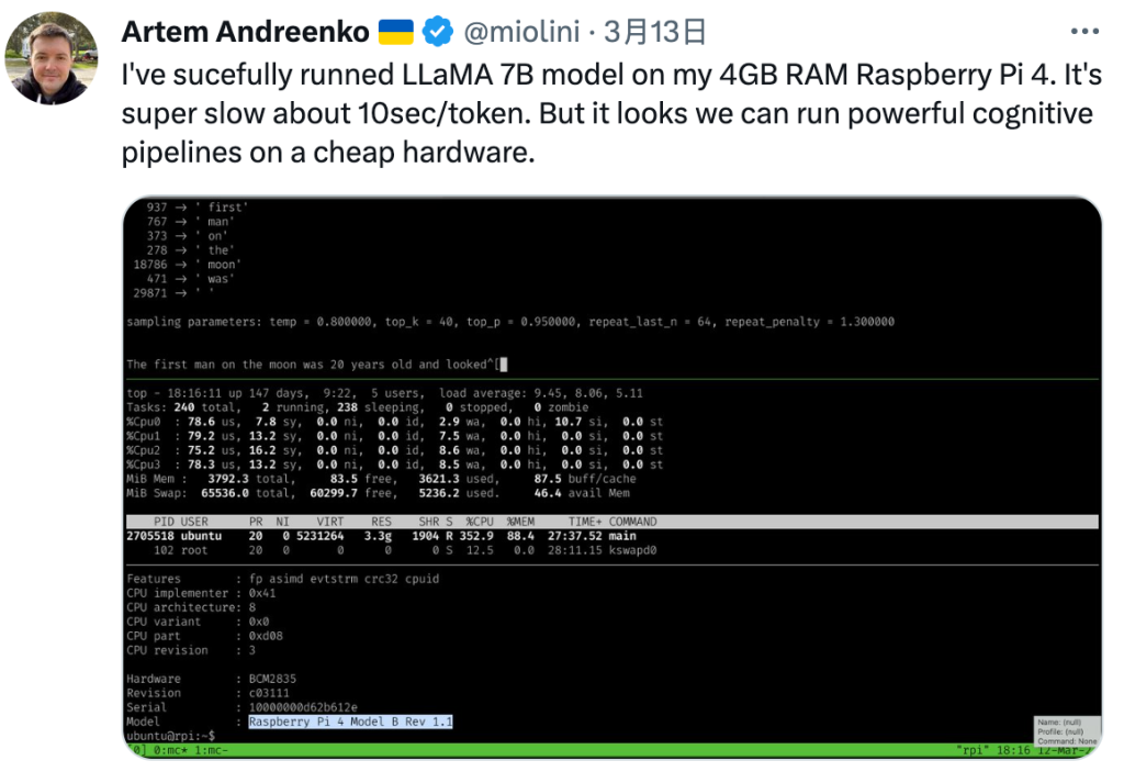 研發(fā)人員Artem Andreenko說,他已在4GB RAM Raspberry Pi 4上成功運行LLaMA 7B 模型。盡管速度很慢,大約10秒/token,但這展現(xiàn)了在便宜的硬件上運行強(qiáng)大認(rèn)知pipelines的可能。