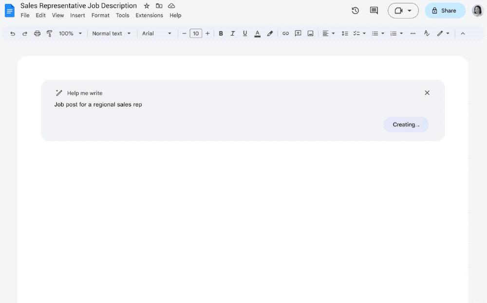本周二,谷歌宣布開放大型語言模型PaLM API,幫助企業(yè)“從簡單的自然語言提示中生成文本、圖像、代碼、視頻、音頻等”。下圖是生成式AI在谷歌文檔中幫助撰寫職位描述的示例。