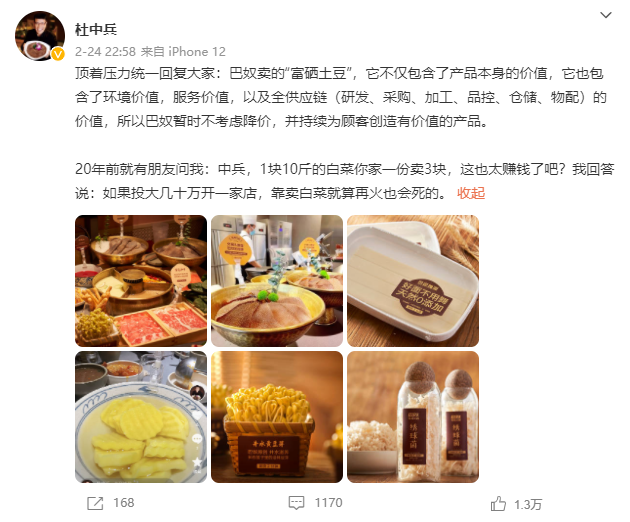 杜中兵稱,巴奴賣的“富硒土豆”,不僅包含產(chǎn)品本身的價值,也包含環(huán)境價值,服務(wù)價值,以及全供應(yīng)鏈的價值,巴奴暫時不考慮降價,并持續(xù)為顧客創(chuàng)造有價值的產(chǎn)品。