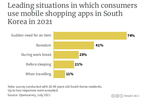 根據(jù)國際貨幣基金組織的報告,2021年,74%的韓國消費者使用移動App網(wǎng)購是因為「突然急需某件物品」,這個比例超過了41%的人「閑逛」網(wǎng)購人群,也高于25%的「工作間隙休息刷刷手機」的網(wǎng)購群體。
