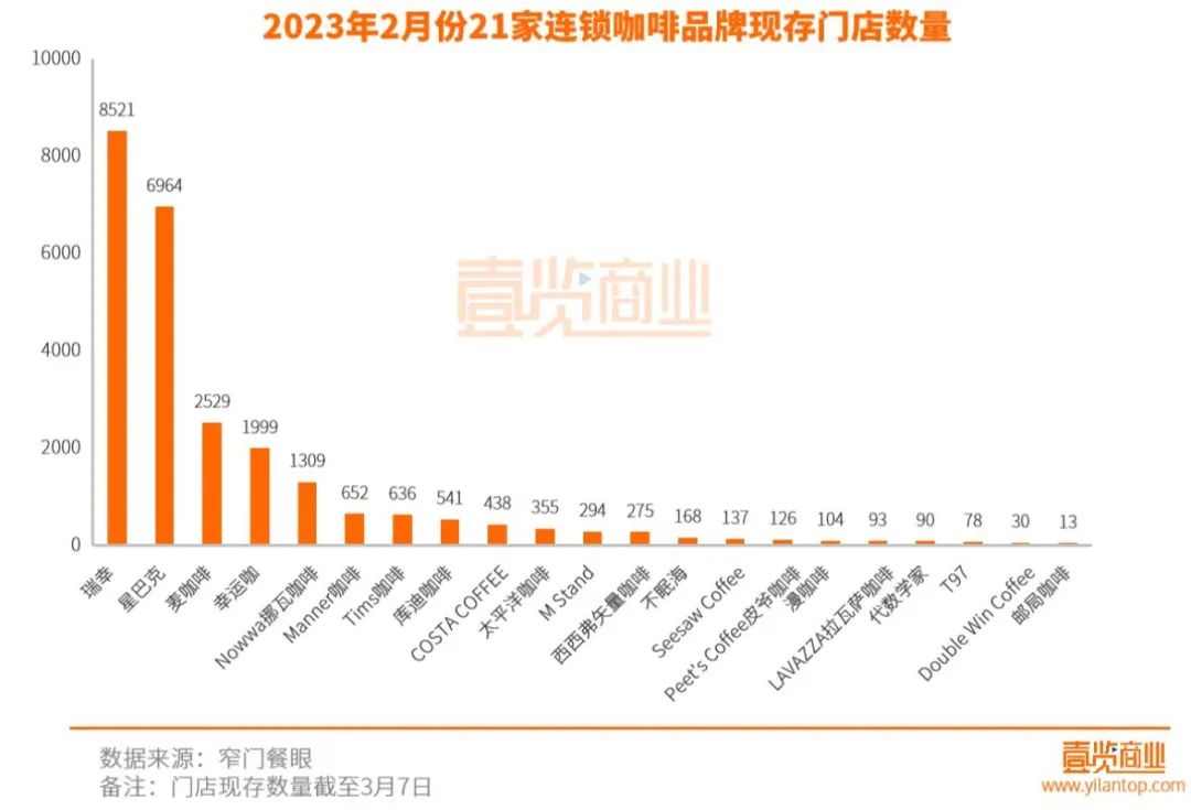 據(jù)壹覽商業(yè)統(tǒng)計(jì)數(shù)據(jù)顯示,截至3月7日,21家連鎖咖啡品牌現(xiàn)存門店數(shù)量達(dá)25352家,其中瑞幸現(xiàn)存門店8521家。