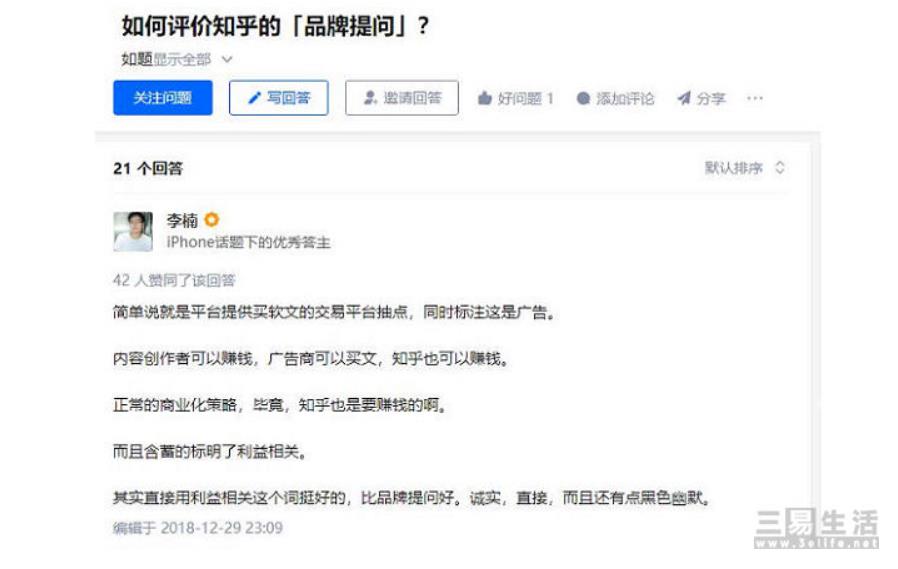 此外,職業(yè)教育業(yè)務(wù)與目前其四大營(yíng)收來源之一的商業(yè)內(nèi)容解決方案,也形成了對(duì)比。要知道所謂商業(yè)內(nèi)容解決方案,指的就是在知乎中出現(xiàn)的“品牌提問”。如果說廣告是硬廣,那么商業(yè)內(nèi)容解決方案其實(shí)就是軟文。但無論硬廣、還是軟廣,其實(shí)多少都會(huì)與知乎的社區(qū)生態(tài)產(chǎn)生直接沖突。