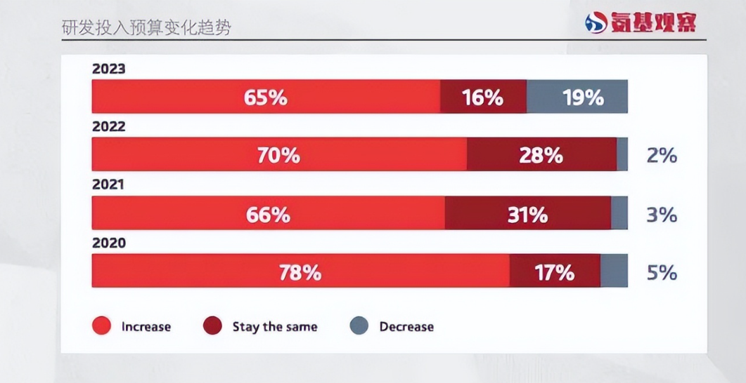 而減少研發(fā)投入的企業(yè),則從2022年的2%,增加到了19%,近四年來首次超過5%。