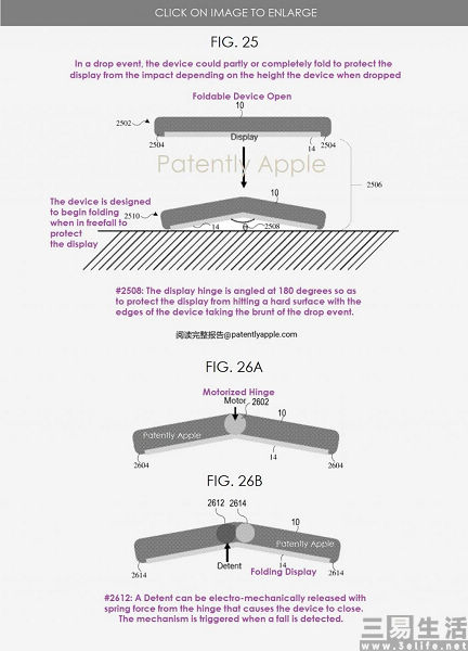 在蘋果的這份專利文件中描述了這樣一個(gè)技術(shù),即通過在設(shè)備中使用的傳感器來檢測(cè)豎向加速度,以確定設(shè)備是否已經(jīng)掉落。如果加速度超過設(shè)定的閾值時(shí),則意味著設(shè)備已經(jīng)掉落,其柔性屏之間鉸鏈連接的釋放機(jī)制就將被激活,讓設(shè)備可以實(shí)現(xiàn)自動(dòng)折疊。