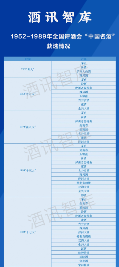 梳理歷屆“名酒”名單可以看到,從第一屆茅臺、汾酒、瀘州大曲酒、西鳳酒的“四大名酒”到第五屆的“十七大名酒”,基本遵循只添不減的規(guī)律。是以,第五屆評選出的“十七大名酒”名單可以說是中國最全的“名酒”榜單。