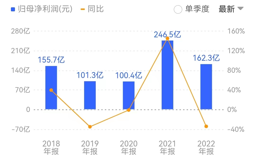 從近五年萬(wàn)華化學(xué)的業(yè)績(jī)來(lái)看,公司凈利潤(rùn)均在百億以上。其中,2021年得益于全球化工產(chǎn)品階段性供需失衡,化工產(chǎn)品價(jià)格普漲,公司營(yíng)收首破千億,凈利潤(rùn)也創(chuàng)下246.5億元新高。