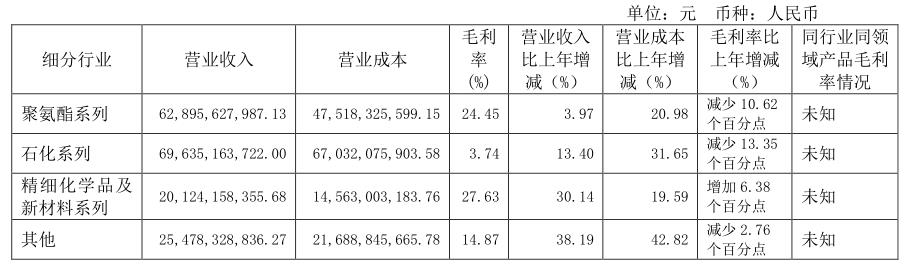 分行業(yè)看,萬(wàn)華化學(xué)主營(yíng)業(yè)務(wù)包括聚氨酯、石化、精細(xì)化學(xué)品及新材料三大板塊。其中,聚氨酯系列營(yíng)收較去年增長(zhǎng)3.97%,但毛利率較去年減少10.62個(gè)百分點(diǎn);石化系列營(yíng)收較去年增長(zhǎng)13.40%,但毛利率同比減少13.35個(gè)百分點(diǎn)。