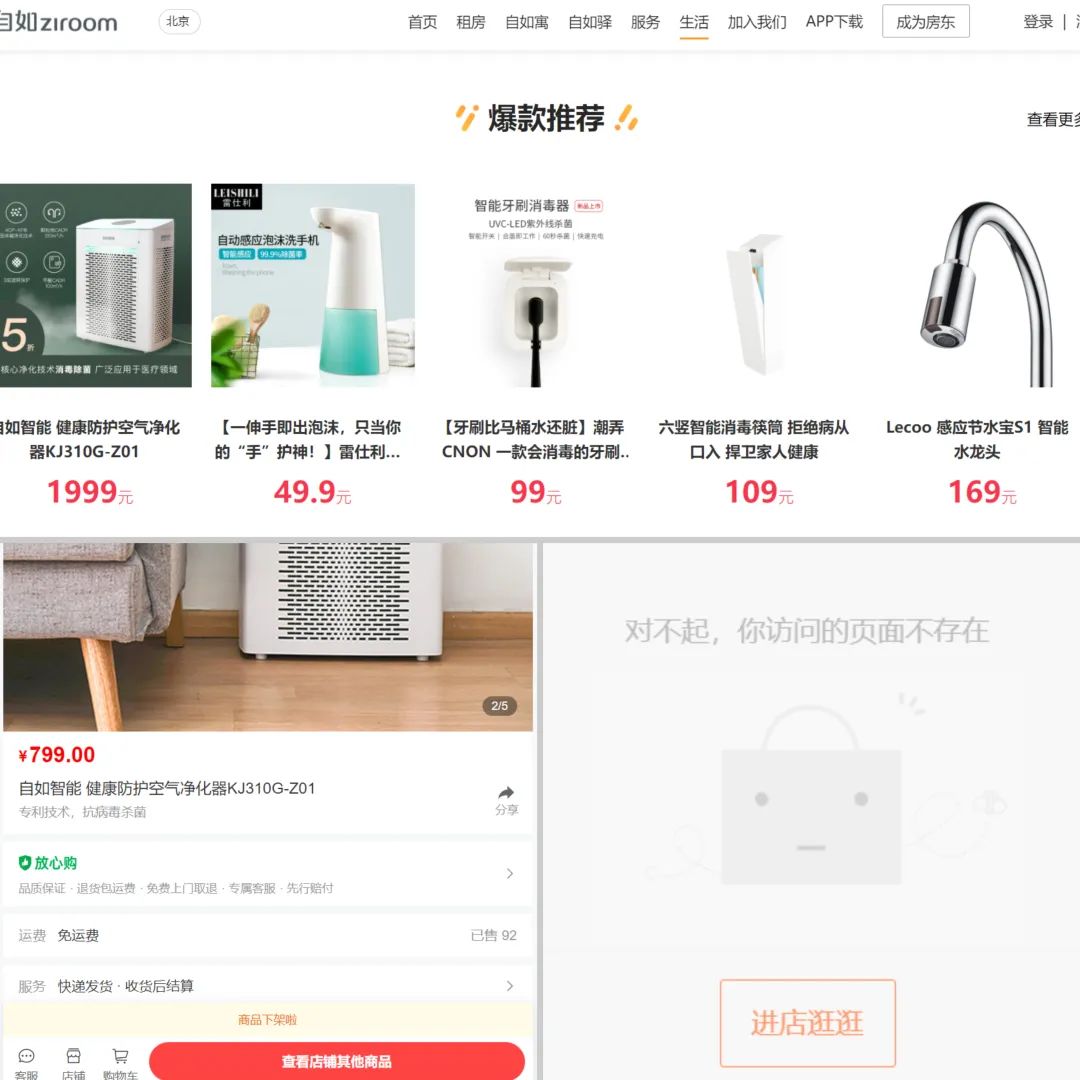 以生活服務(wù)(電商)為例,3月17日,燃次元打開自如-生活版塊,其頁面展示的5個商品,無一可購買,其中3個商品顯示“商品下架”,2個商品顯示“訪問的頁面不存在”。