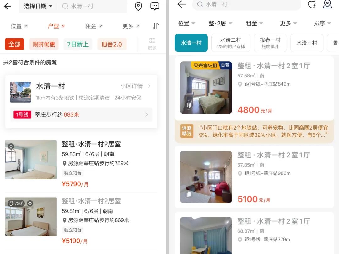 圖/上海閔行莘莊地區(qū)“水清一村”整租二居價格對比(左為自如,右為貝殼)
