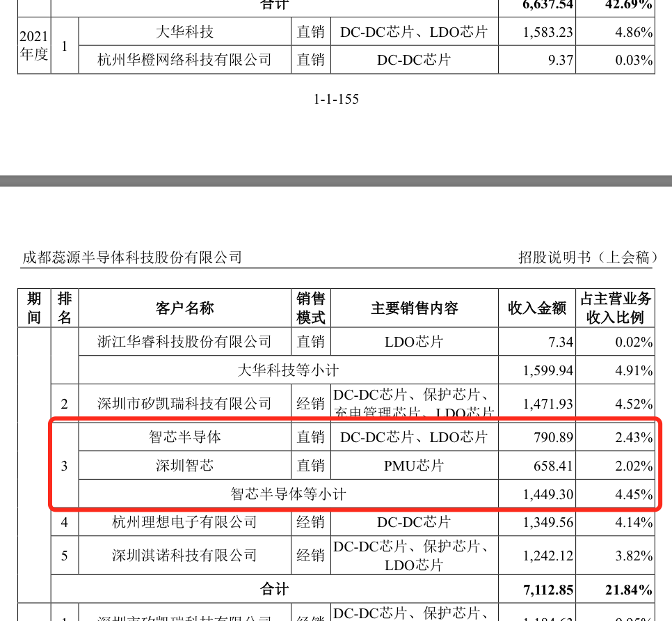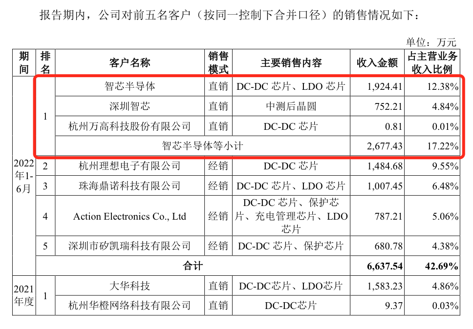 從披露來看,2021年第三大客戶即智芯半導體等小計的金額為1449.3萬元,占到了主營業(yè)務收入比例4.45%;2022年上半年智芯半導體等小計金額上升到了2677.43萬元,占主營業(yè)務收入比例為17.22%。其對蕊源科技的重要性不言而喻。