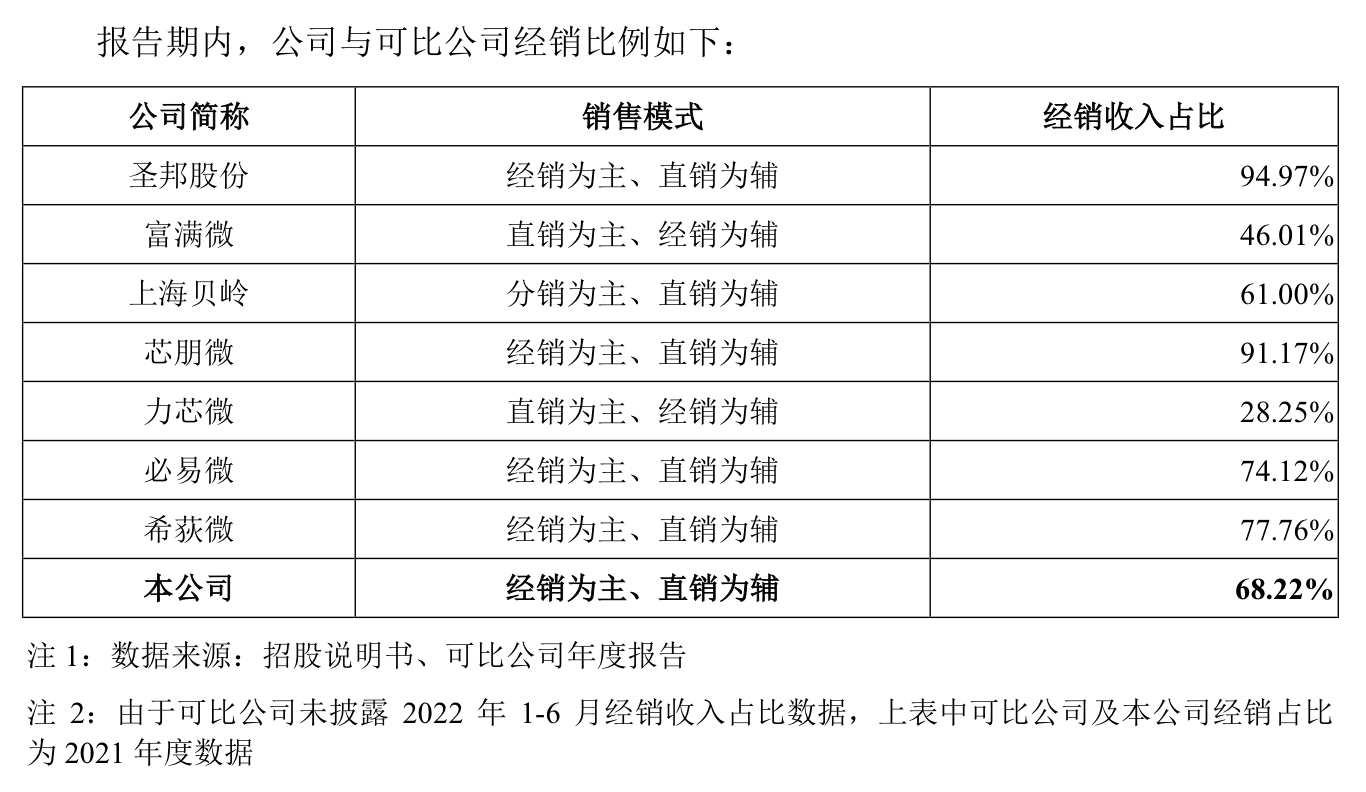 蕊源科技還在說明書中列舉了行業(yè)里的慣例,不少可比公司的經銷收入占比也都較高。