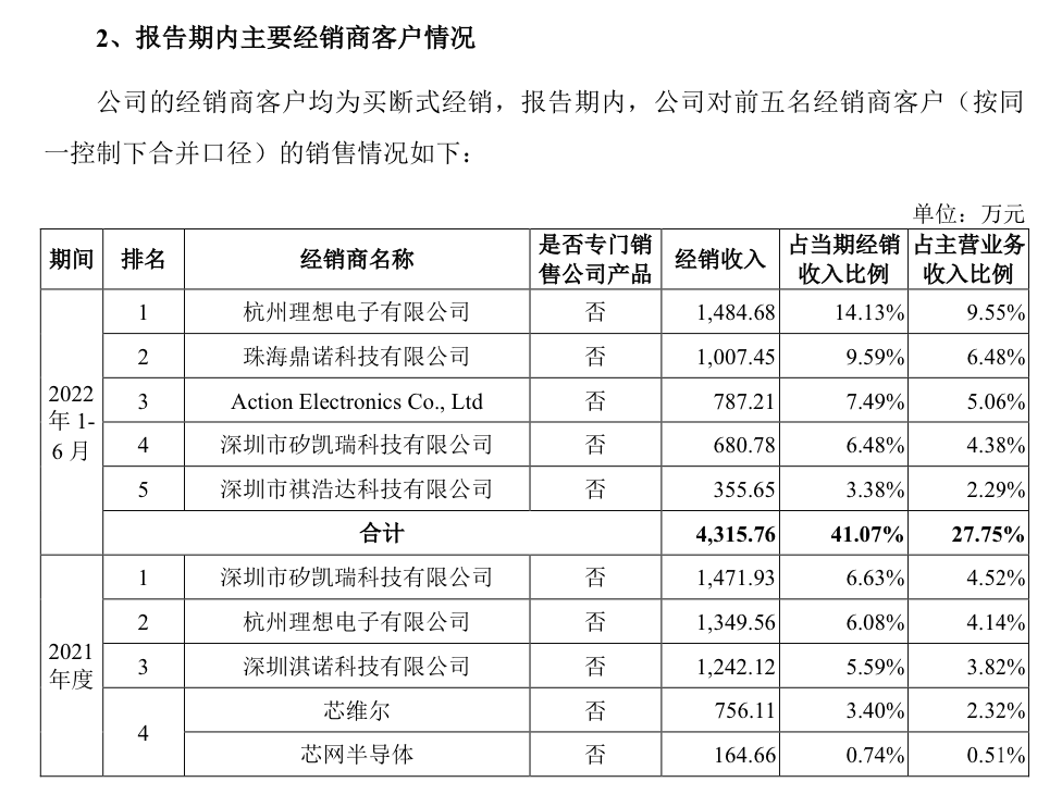 上海沐矽昕電子科技有限公司是2017年9月成立的,該公司2019年便進入到了蕊源科技的前五大經銷商名單,且只在名單上待了1年;深圳市浩恩科技有限公司成立于2017年8月,2020年出現在蕊源科技前五大經銷商名單中,也僅此一次;另外珠海鼎諾科技有限公司成立于2019年4月28日,目前是蕊源科技2022年上半年第二大經銷商。另外芯維爾則系公司前員工崔進實際控制的企業(yè)。