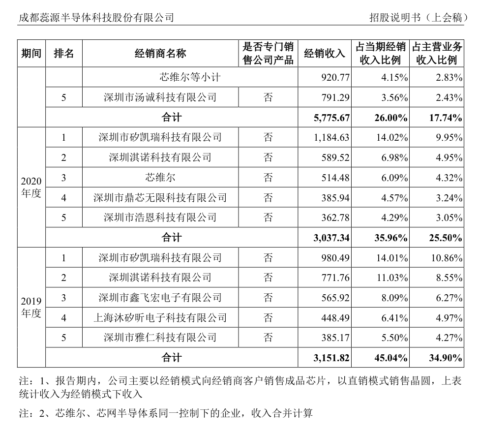 從說明書看,蕊源科技采用“經銷為主、直銷為輔”的銷售方式,報告期內各期,公司經銷模式實現收入比重分別為77.50%、70.92%、68.22%、67.57%,占比較高。對于這種銷售方式,蕊源科技有解釋稱主要原因系:
