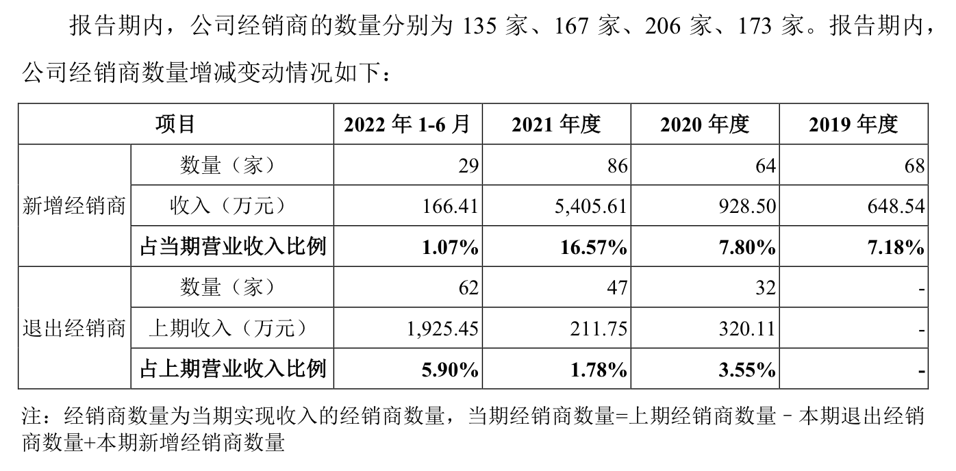 對于經銷商的變動,有數據顯示,蕊源科技2022年上半年退出的經銷商達到62家,新增29家;2021年退出47家,新增86家;2020年退出32家,新增64家。對此公司解釋,退出的經銷商主要為前期因偶發(fā)性、小批量采購形成的經銷商客戶。